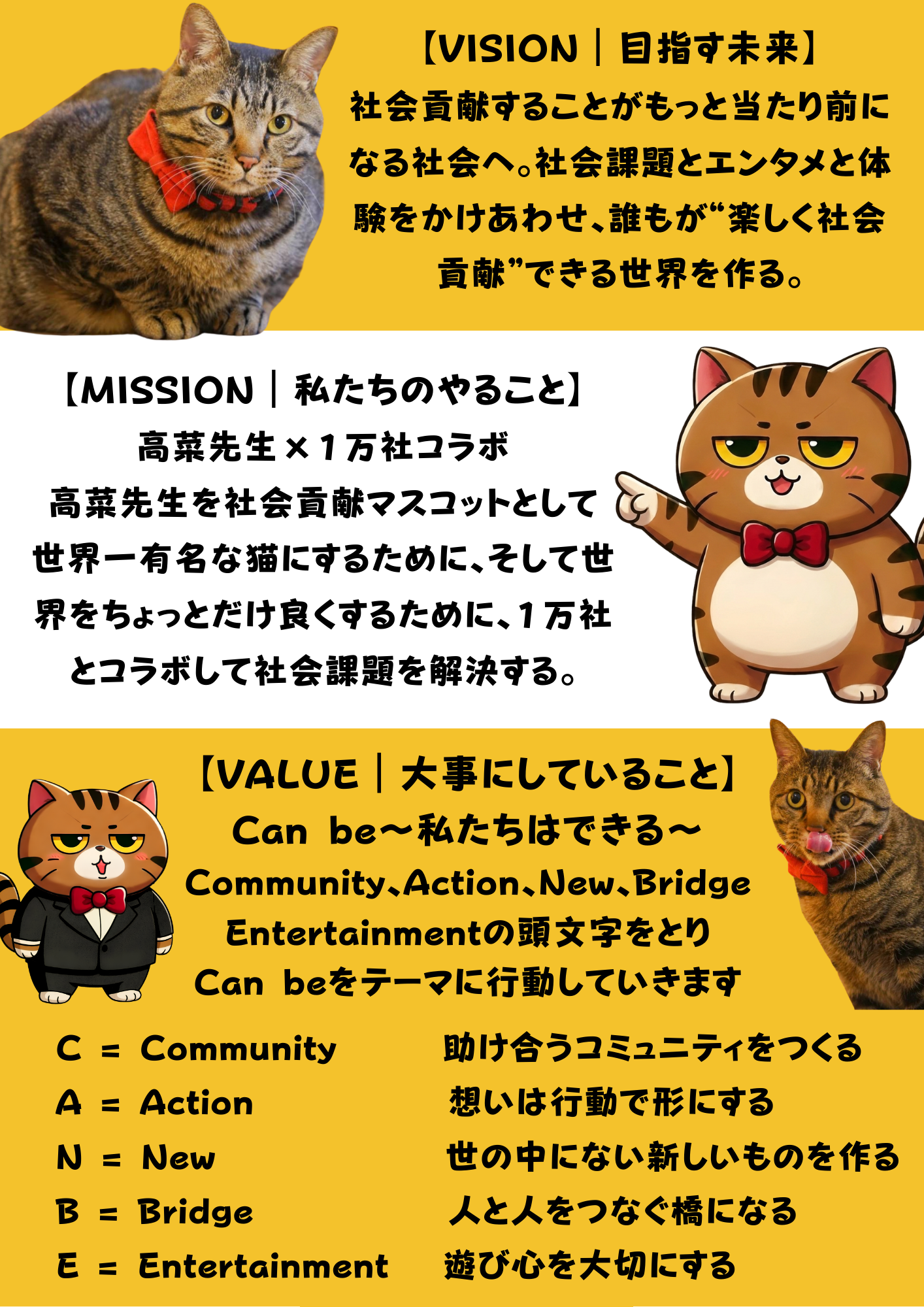 私たちは、理念を軸に経営を行っています。事業の規模や売上だけでなく、「イイコトをして高菜先生を世界一有名な保護猫にする」という想いを何より大切にしています。