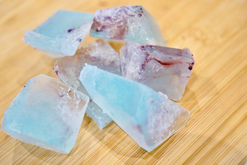 冷蔵で10分ほど置き、固まったら型から外します。この瞬間にキラキラとした宝石のような石鹸が現れます。