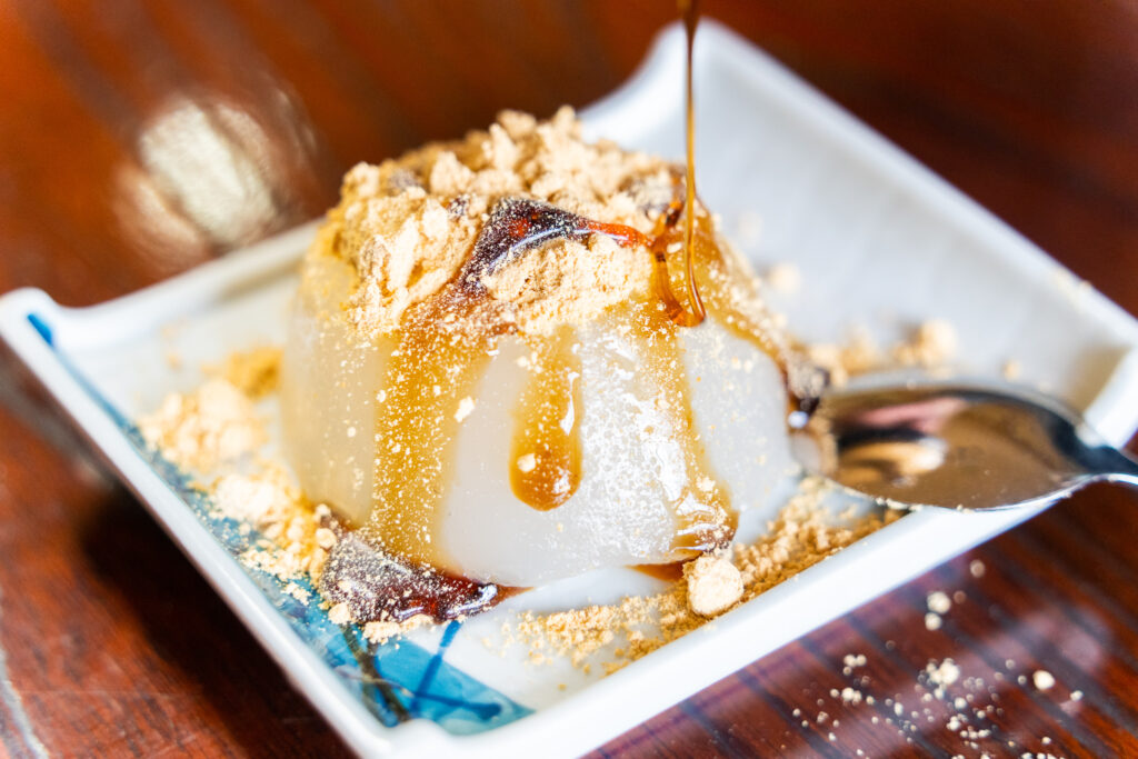 冷やしてプルプルに固まった餅に、仕上げとしてたっぷりの黒蜜ときな粉をお好きなだけかけて完成させます。トッピングは自分好みにアレンジできるので、世界にひとつだけのオリジナル餅スイーツが楽しめます。盛り付けも自由自在。仕上がった瞬間は、思わず写真を撮りたくなる“映えポイント”です。